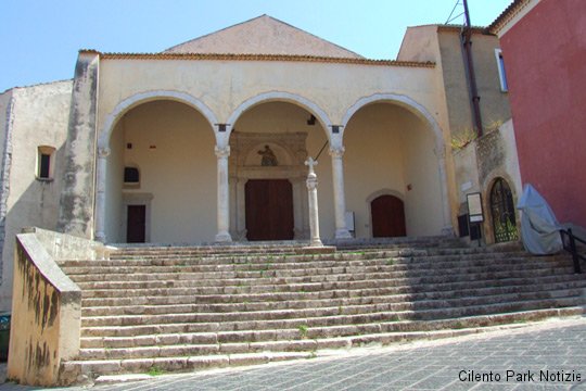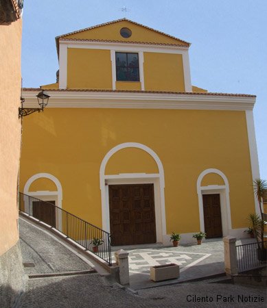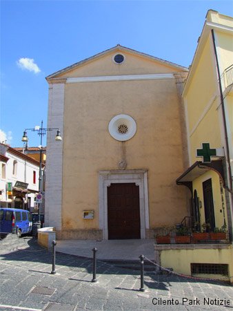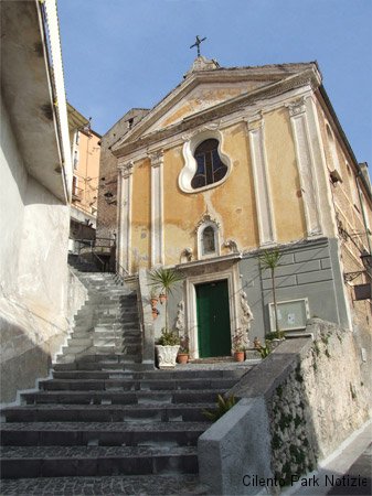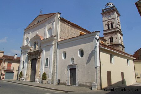 Church of the Assumption in Sanza: Showcases a prominent main portal made from Padula stone, a renowned wooden crucifix, and significant silver artifacts, including a processional cross and chalice from Naples dating back to the 1730s.